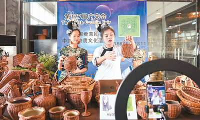 广交会期间,贵州省黔东南苗族侗族自治州榕江县古州镇水榭榕城小区瑜懿蕨编工坊的工作人员在“云端”推介当地70多种“非遗”蕨编产品。(图片来源:人民图片 王炳真摄)